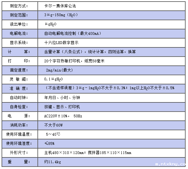 仪器符合GB/T7600;SH/T0246;GB/T606及采用卡尔—费休法测定样品中水分的有关标准。 仪器采用了先进的自动控制电路,电解电流自动跟踪控制,外型结构新颖,从而使该仪器工作更可靠,使用更方便,具有分析速度快(一分钟出结果)、操作简便、精度高、自动性强等特点,同时具有自动打印功能,可将实验结果、做样时间、样品编号自动打印出来,广泛应用于石油、化工、电力、铁路、环保等部门。