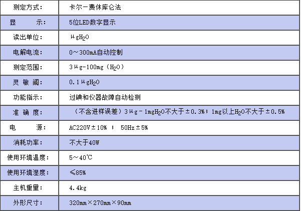 仪器符合GB/T7600;SH/T0246;GB/T606及采用卡尔—费休法测定样品中水分的有关标准。仪器采用了先进的自动控制电路,电解电流自动跟踪控制,外型结构新颖,增加了过碘指示和仪器故障自动检测功能,从而使该仪器工作更可靠,使用更方便, 具有分析速度快(一分钟出结果)、操作简便、精度高、自动性强等特点,广泛应用于石油、化工、电力、铁路、环保等部门。