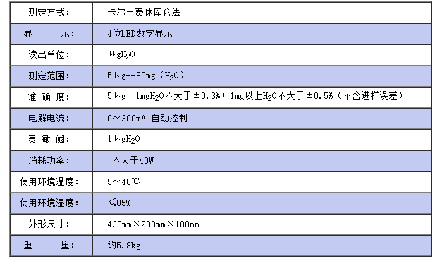 仪器符合GB/T7600及采用卡尔—费休法测定样品中水分的有关标准,仪器采用了先进的自动控制电路,电解电流自动跟踪控制,外型结构新颖,从而使该仪器工作更可靠,使用更方便, 具有分析速度快(一分钟出结果)、操作简便、精度高、自动性强等特点,广泛应用于石油、化工、电力、铁路、环保等部门。